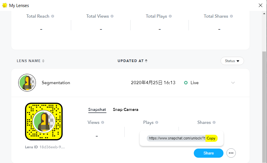 9.Shareボタンを押すとURLが表示され、それをSnap Cameraで検索すると作成した背景が現れる。