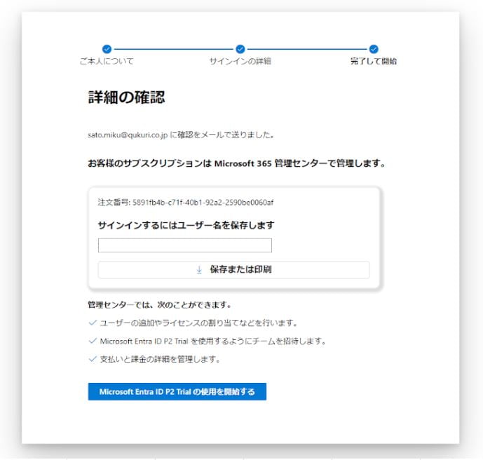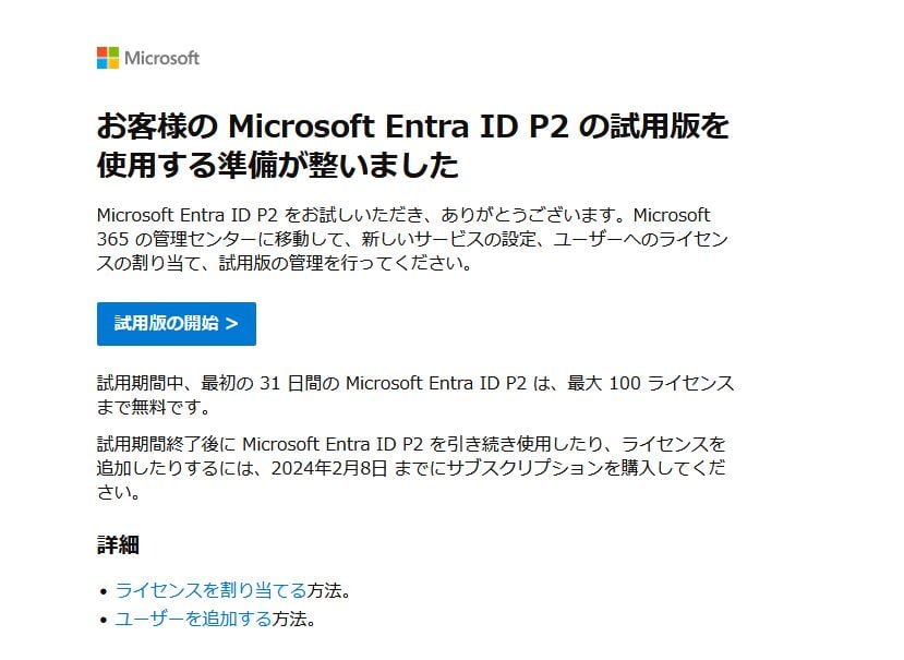 件名「新しい Microsoft Entra ID P2 の試用版の使用を開始する」を開き、