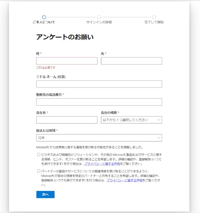 3. 姓名、会社名などを入力して「次へ」をクリック