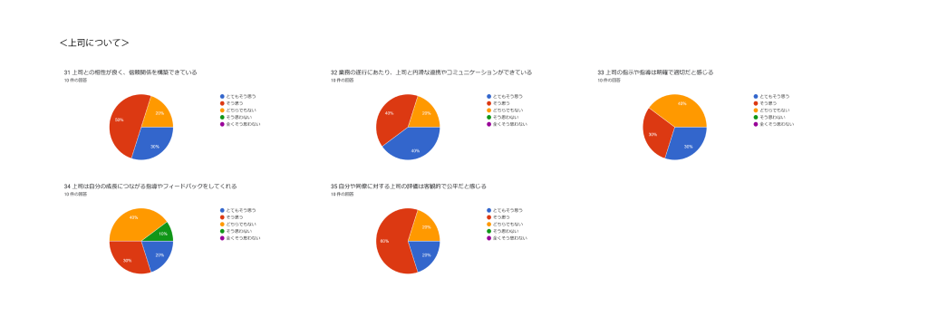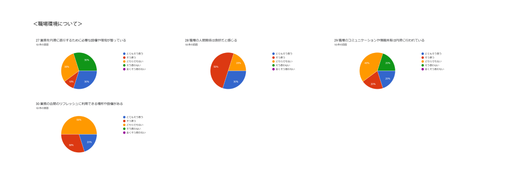 職場環境についての項目では、緑色(そう思わない)がやや目立ちます。