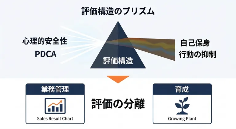 「業務の結果でのみ評価し、育成では評価しない」。このルールを事前に明確に定めておくこと。それが、評価構造が全てを無効化するという矛盾を乗り越えるための、私なりの答えだ。